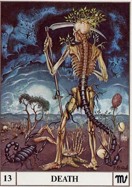Тринадцатая карта в колоде Таро – «Смерть». У древних евреев число 13 и слово смерть писались одним знаком. Тринадцатая буква древнееврейского алфавита - "mem". Впрочем "Смерть" не такая уж и страшная карта, как может показаться на первый взгляд. Означает, что Ваше мировоззрение расширяется. Вы отказываетесь от ограничений, и для Вас "Смерть" не означает физический конец, а говорит об окончании существующей ситуации, которая предполагает глубокие перемены в психике и взглядах на мир. Карта Таро Смерть - это символ перемен. О том, какие перемены Вас ожидают, расскажут последующие карты. Но в любом случае у Вас будет шанс на новый старт в жизни. В целом карта предвещает конец старой жизни, связанные с этим неизбежные утраты. Причиной появления карты может быть смена места работы, женитьба или развод.